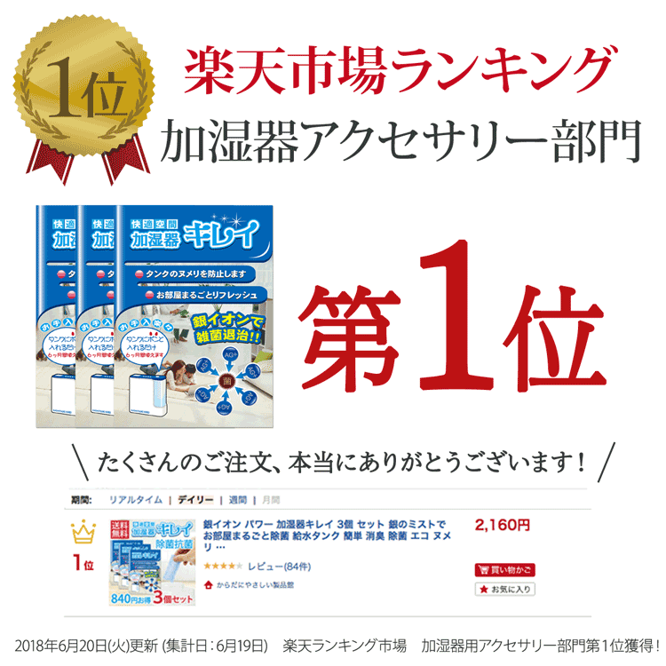 銀イオンの除菌効果でタンクを除菌・抗菌 加湿器キレイ豆知識 加湿器キレイは加湿器の水タンクだけではなく、除湿機、冷蔵庫の製氷機タンクにご利用いただけます! 加湿器キレイお買い得な3個入パック 1個で加湿器の水タンク1.5リットルに対応いたします。