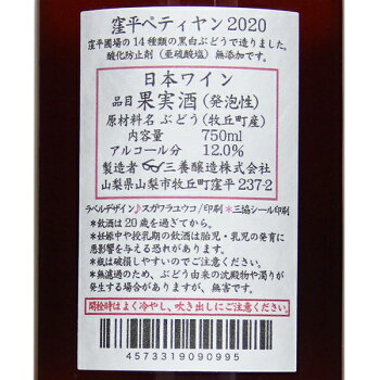 【無添加 窪平ペティヤン2020】三養醸造[窪平ペティヤン 2020 750ml]赤ワイン 微発泡 辛口 日本 ワイン 山梨 国産 サンヨー 猫